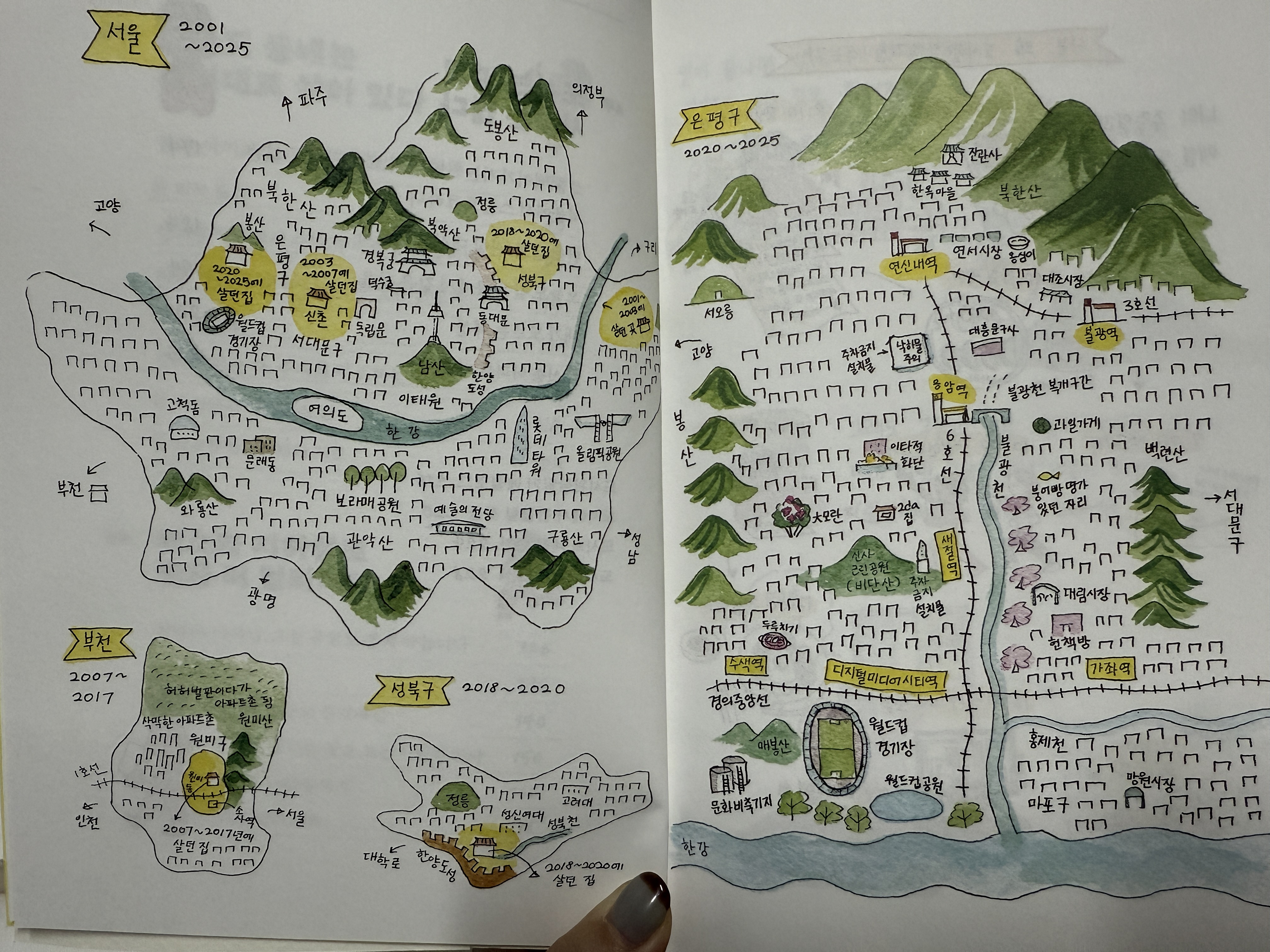 책은 작가님이 직접 걸으며 두 손으로 기록한 도시의 모습이 생생하게 그려져 있습니다! 선 몇 번으로 그려진 그림에도 섬세한 터치가 더해져 바라만 보고 있으면 그 동네의 분위기가 머릿속으로 떠오르기도 했습니다. 그럼 관찰일기에서 발견한 도시의 흥미로운 모습을 몇 가지 소개하면서 책을 탐구해보겠습니다🏃 그 전에! 책에 나와있는 도시 관찰 준비물과 방법을 공유하겠습니다.