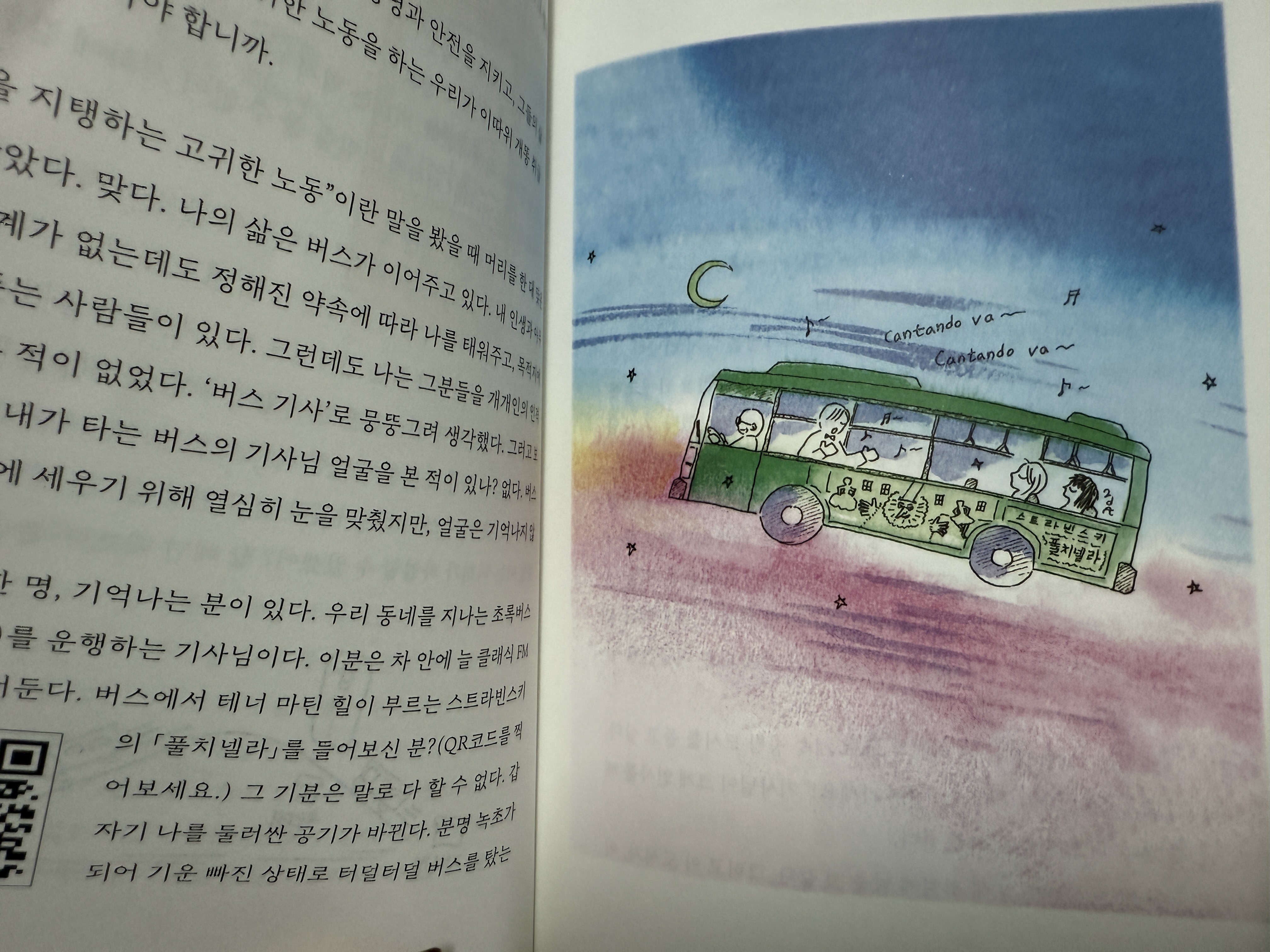 버스를 자주 타고 다니시는 분들은 아시겠지만, 버스 안 공기는 다양합니다. 저는 자주는 아니고 종종 버스를 타는데 우연인지 아니면 그런 버스만 골라 타는 건지 모르겠지만 아무 것도 틀어놓지 않고 정류장을 알려주는 여자분의 목소리만 들리는 경우가 많았습니다. 간혹 라디오를 틀어두시는 기사님들도 계셨습니다. 작가님은 초록버스를 운행하는 조금은 특별한 기사님의 이야기를 들려주셨습니다. 이분의 차 안에는 늘 클래식 FM 채널을 틀어둡니다. 버스에서 테너 마틴 힐이 부르는 스트라빈스키의 '풀치넬라'가 흘러나옵니다.
