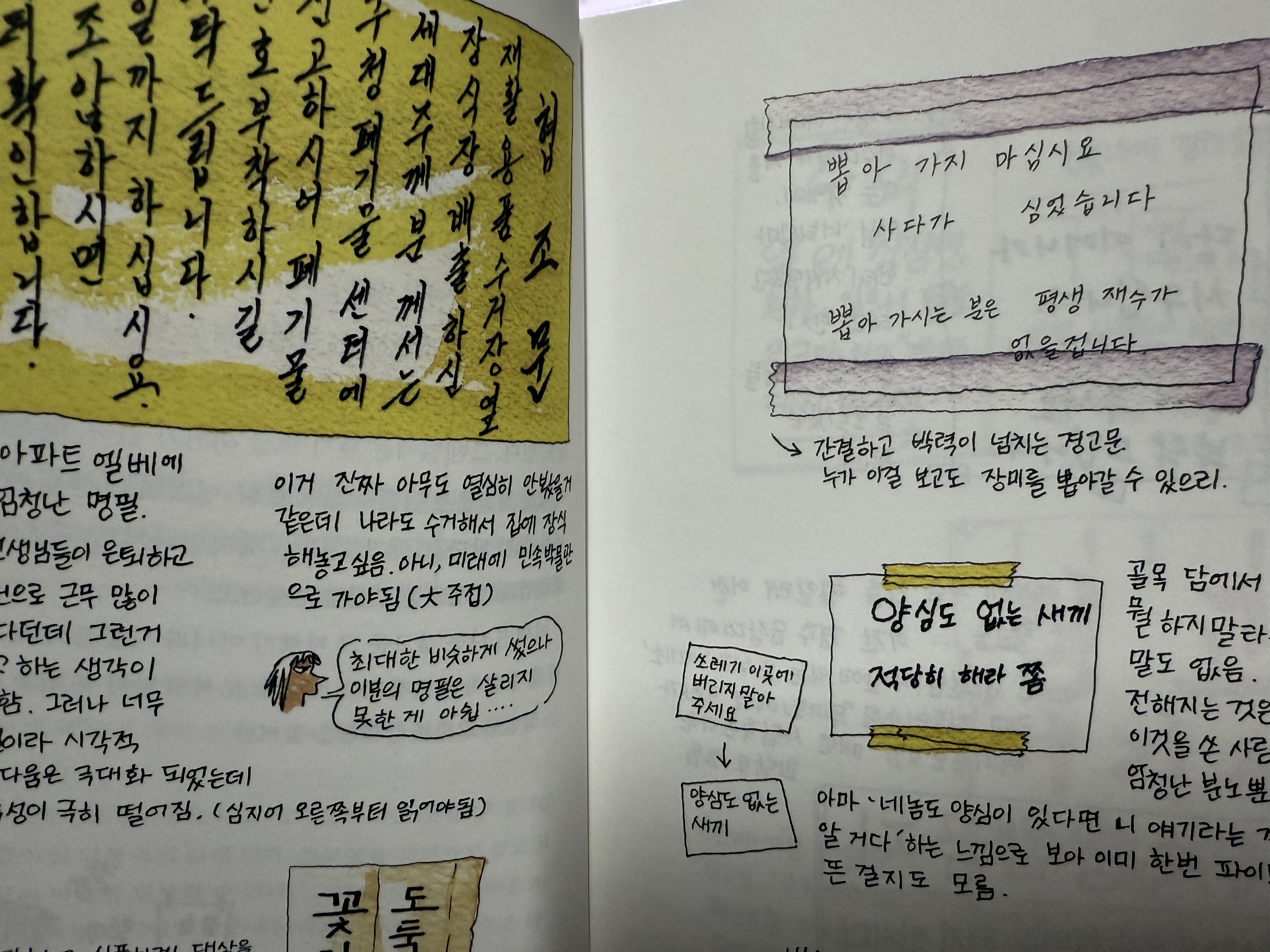 길을 가다가 간혹 담벼락에 '쓰레기 버리지 마세요. 신고합니다!', '담배꽁초 버리지 마세요'라는 등의 경고문이 붙어 있는 걸 볼 수 있습니다. 저희 집 주변에도 '할머니께서 치우시기 힘드니 쓰레기를 제대로 버려주세요'라는 식의 경고문을 본 적이 있습니다. 모든 경고문의 공통점은 하나같이 분노에 차있는 문체라는 것입니다. 뜻과 경고하고자 하는 것들은 모두 다르지만 글에서 느껴지는 짜증은 이상하리만큼 똑같았습니다.